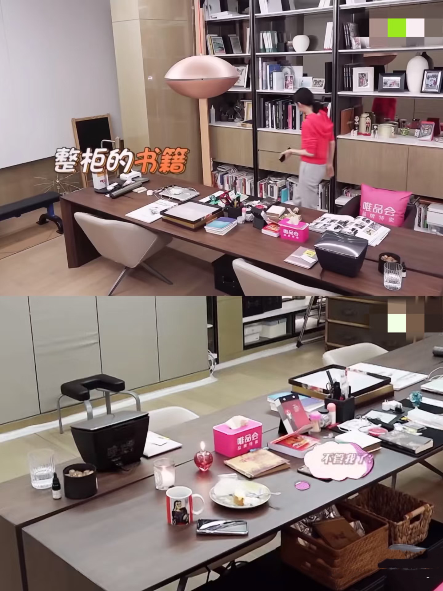 因为要每每在家里责任,王鸥给我方安排了整面墙的书橱。书橱外面是实木的长条桌,平淡王鸥就在这里惩办一些基本的责任,比如背台词、拍视频等等。